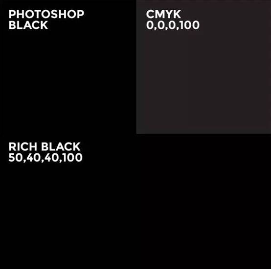 如果是黑色文字,可以是0,0,0,100(單黑),但如果是大片背景色就不合適了,因?yàn)樵谟∷⒅袝?huì)看起來是深灰,而不是黑色。因此,大面積黑色最好使用4色黑,數(shù)值組合選擇固然多,但是50,40,40,100經(jīng)驗(yàn)證為最受歡迎之選,在單黑中混入其它色彩讓黑色看起來更厚重,并且4色數(shù)值總和也未超出安全范圍。